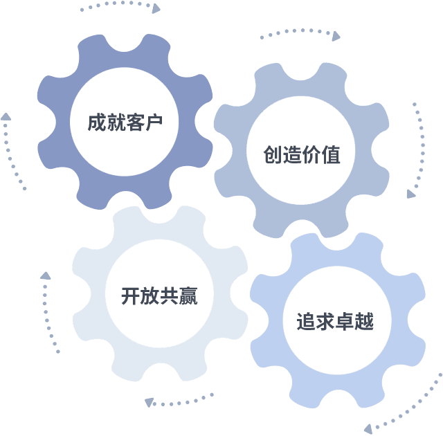 成就客户是一切决策的出发点,,创造价值是衡量所有工作的标准,,,追求卓越是我们做事做人的态度,,开放共赢是我们的格局也是最终的结果。。。。价值观的齿轮环环相扣,,推动着组织里的每个人不断向前。。